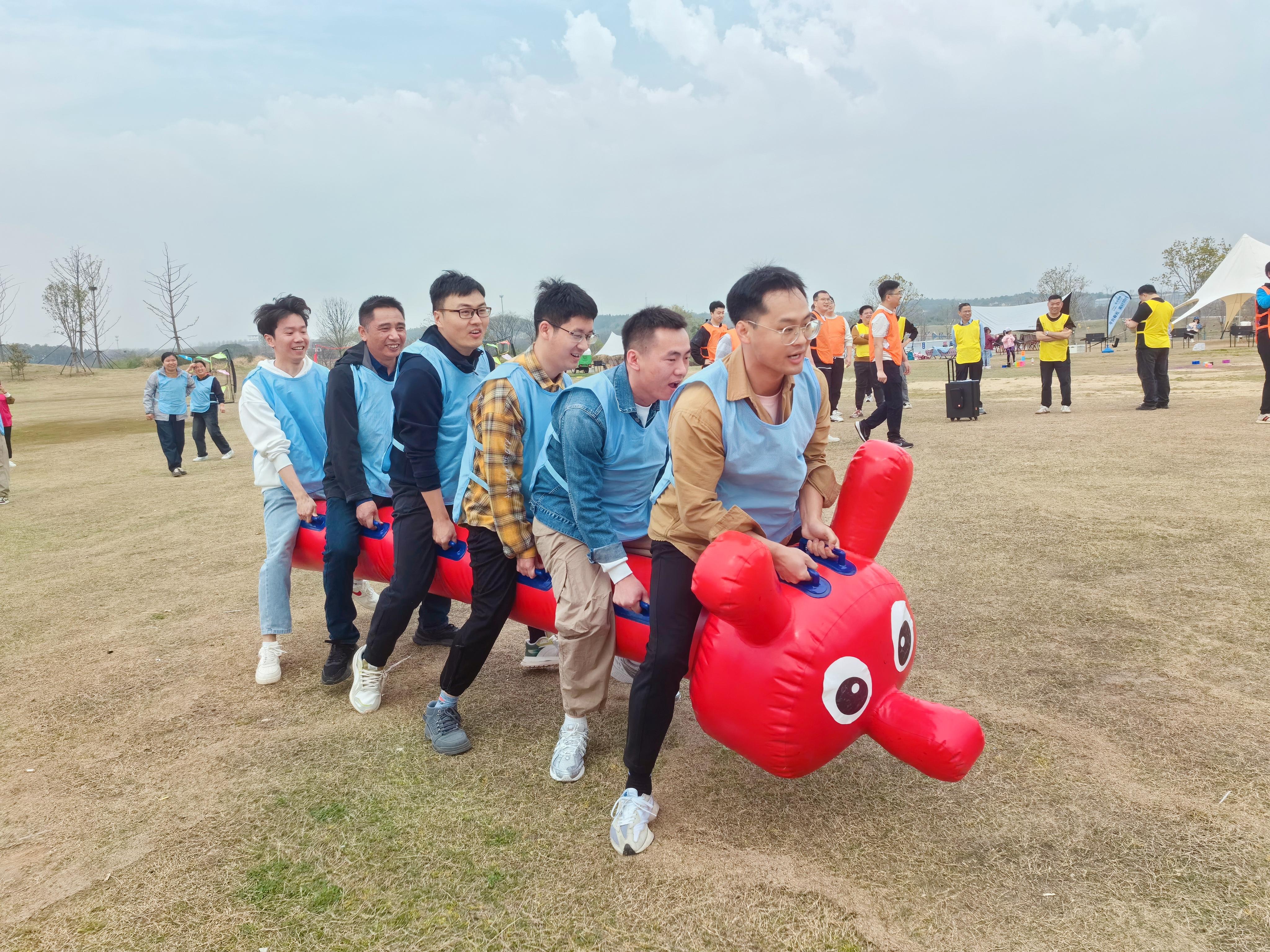 在愜意閑適的湖邊徒步熱身后,大家在寬闊平整的綠茵草地上正式開啟此次戶外團建?;顒娱_始,大家分成紅、黃、橙、藍四色小組,各組隊員在組長的指揮和布陣下,通力合作,角逐壘方塊、連連看、拋飛盤等團隊競賽的魁首。在這些充滿創意與趣味的活動中,合作與競爭巧妙融合,同事之間的距離被悄然拉近;當隊員不慎跌倒落后時,大家相互鼓勵,起身再戰;當團隊頻頻得分領先時,大家擊掌擁抱,歡呼雀躍,現場喝彩之聲此起彼伏,各隊成員密切配合,展現出高效一致的執行力和協助配合的團隊精神。