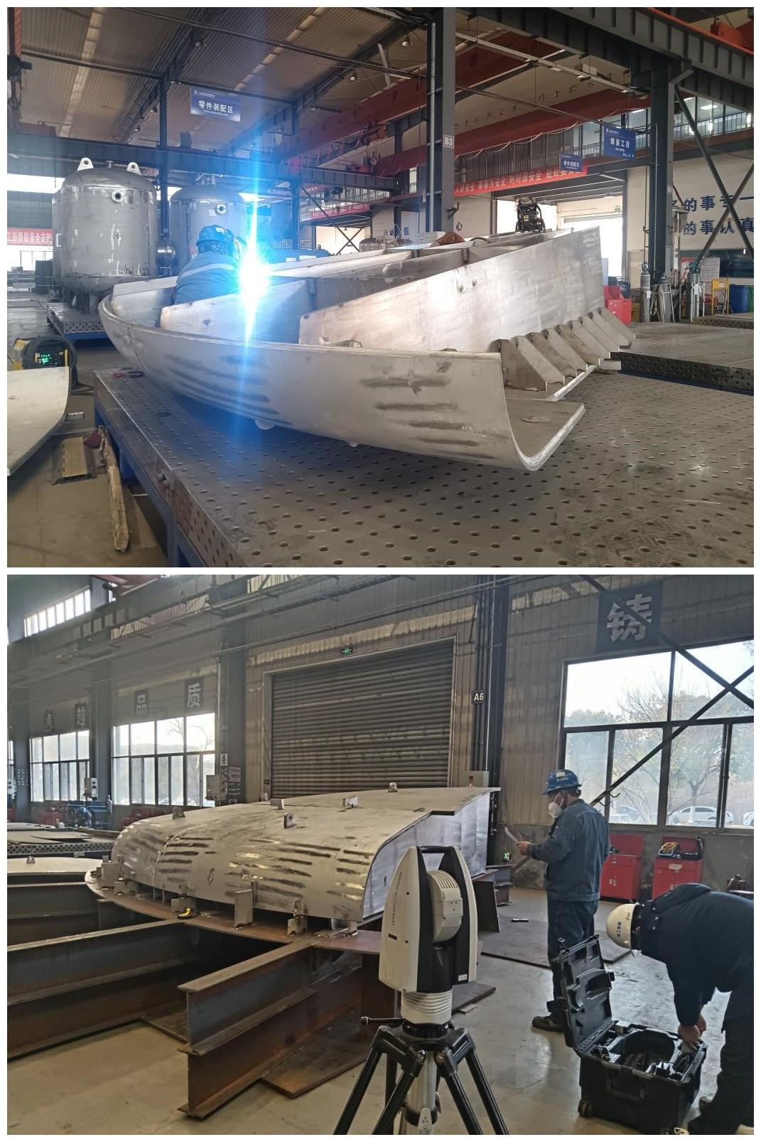 項目籌備精益求精。項目初期,項目團隊相繼成立“星火聚變”黨員突擊隊和“披荊斬棘”青年創(chuàng)新突擊隊,突擊隊根據(jù)客戶要求及11m超大直徑帶來的制造及運輸難點,經(jīng)過多輪技術(shù)評審明確了分瓣封頭的材質(zhì)要求、尺寸規(guī)格及特殊工藝需求。技術(shù)人員進行三維建模、焊縫模擬分析、尺寸鏈分析等多輪分析,確保每個零件的每個工序尺寸都符合設(shè)計要求。同時,生產(chǎn)人員制定了詳盡的生產(chǎn)計劃,并進行全流程動態(tài)跟蹤,從原材料采購到封頭壓制、預(yù)組對、1/8組焊,每一步都力求精準無誤。